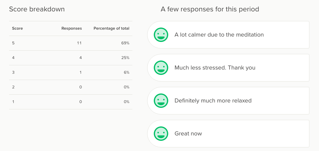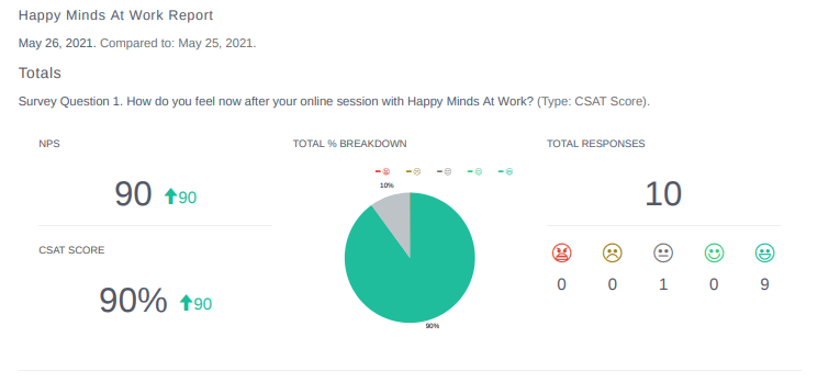 Clients who take our trial offer, select a few of their employees to join free Happy Minds At Work 15 minute sessions. After each session, employees then rate the session with a quick and easy happy face score meter, and offer any comments they wish. The analysis is then presented to the client for their consideration. The results of the trial help to form the basis for the business requirements for the client, and it helps to illustrate the efficacy of our services.
